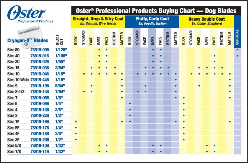 An A5 blade chart is an invaluable tool that lists the different sizes and their corresponding cutting lengths. This chart helps you identify the appropriate blade size for achieving the desired fur length on your dog.